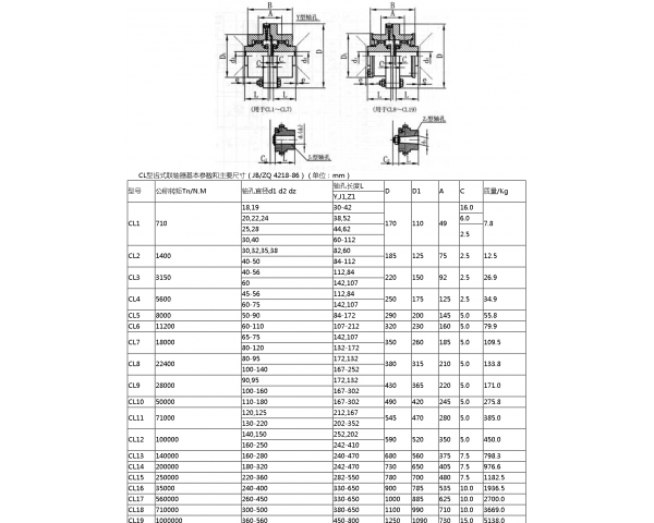 CL型齒式聯(lián)軸器屬于可移式剛性聯(lián)軸器,由兩個(gè)有內(nèi)齒的外殼和兩個(gè)外齒的套筒所組成,套筒和軸用鍵聯(lián)接,兩個(gè)外殼用螺栓聯(lián)成一體,外殼和套筒之間設(shè)有密封圈。內(nèi)齒輪齒數(shù)和外齒輪齒數(shù)相等,通常采用壓力角為20°的漸開線齒廓。工作時(shí)靠嚙合的輪齒傳遞扭矩。由于輪齒之間留有較大的間隙,所以能補(bǔ)償兩軸的不同心和偏斜,為了減少輪齒的磨損和相對(duì)位移的摩擦阻力,在內(nèi)部注入潤(rùn)滑油。齒式聯(lián)軸器的角位移允許在30′。齒式聯(lián)軸器具有徑向、軸向和角向等軸線偏差補(bǔ)償能力,具有結(jié)構(gòu)緊湊、回轉(zhuǎn)半徑小、傳遞扭矩大、傳動(dòng)、噪聲低及維修周期長(zhǎng)等優(yōu)點(diǎn),特別適用于低速重載工況,如冶金、礦山、起重運(yùn)輸?shù)刃?業(yè)、也適用于石油、化工、通用機(jī)械等各類重型機(jī)械的軸系傳動(dòng)。