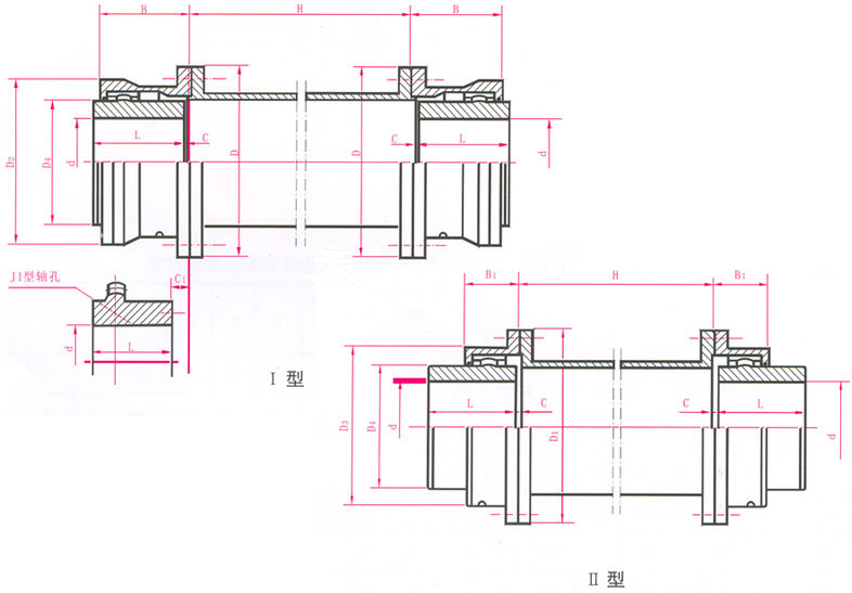 WGT型中間套鼓形齒式聯(lián)軸器屬于剛撓性聯(lián)軸器,特別適用于低速重載工況,如冶金、礦山、起重運輸?shù)刃袠I(yè)、也適用于石油、化工、通用機械等各類機械的軸系傳動。齒式聯(lián)軸器是由齒數(shù)相同的內(nèi)齒圈和帶外齒的凸緣半聯(lián)軸器等零件組成。外齒分為直齒和鼓形齒兩種齒形,所謂鼓形齒即為將外齒制成球面,球面中心在齒輪軸線上, 齒側(cè)間隙較一般齒輪大,鼓形齒聯(lián)軸器可允許較大的角位移(相對于直齒聯(lián)軸器),可實際效果為主齒的接觸條件,提高傳遞轉(zhuǎn)矩的能力,延長使用壽命。有角位移時沿齒寬 的接觸狀態(tài)。齒式聯(lián)軸器在工作時,兩軸產(chǎn)生相對角位移,內(nèi)外齒的齒面周期性作軸向相對滑動,必然形成齒面磨損和功率消耗,因此,齒式聯(lián)軸器需在有良好和密封的狀態(tài) 下工作。齒式聯(lián)軸器徑向尺寸小,承載能力大,常用于低速重載工況條件的軸系傳動,精度適宜并經(jīng)動平衡的齒式聯(lián)軸器可用于高速傳動,如燃汽輪機的軸系傳動。由于鼓形齒式聯(lián)軸器角向補償大于直齒式聯(lián)軸器,眾多地區(qū)均廣泛采用鼓形齒式聯(lián)軸器,直齒式聯(lián)軸器屬于被淘汰的產(chǎn)品,選用者應(yīng)盡量不選用。