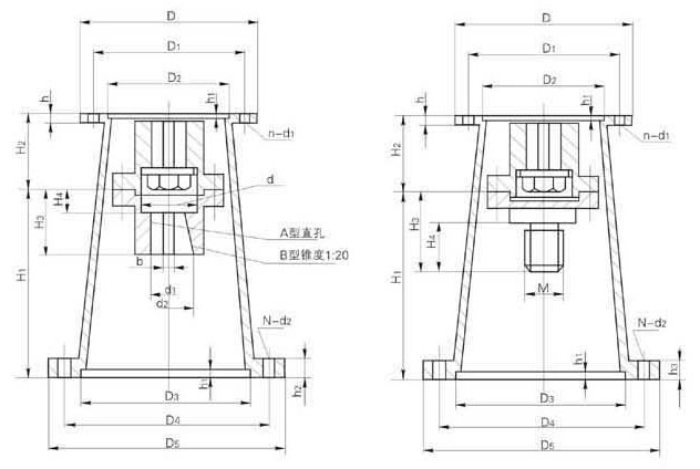 JAI大法蘭機(jī)架<69標(biāo)>、JAII<69標(biāo)> 機(jī)架適用于擺線針輪減速機(jī)的聯(lián)接,配剛性聯(lián)軸器,上聯(lián)軸器裝JA型直孔,下聯(lián)軸器裝A型直孔或B型錐孔,錐度為1:20的聯(lián)軸器。該機(jī)架無支承適用于反應(yīng)器傳來的軸向力不大時(shí)使用。